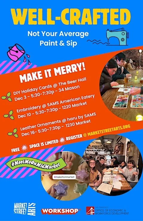 Well-Crafted is a FREE art event presented by Market Street Arts with support from Workshop SF, the San Francisco Office of Economic & Workforce Development, and SAMS American Eatery. Please plan to purchase drinks, mocktails or sodas while you craft to help support our Mid-Market Venues.