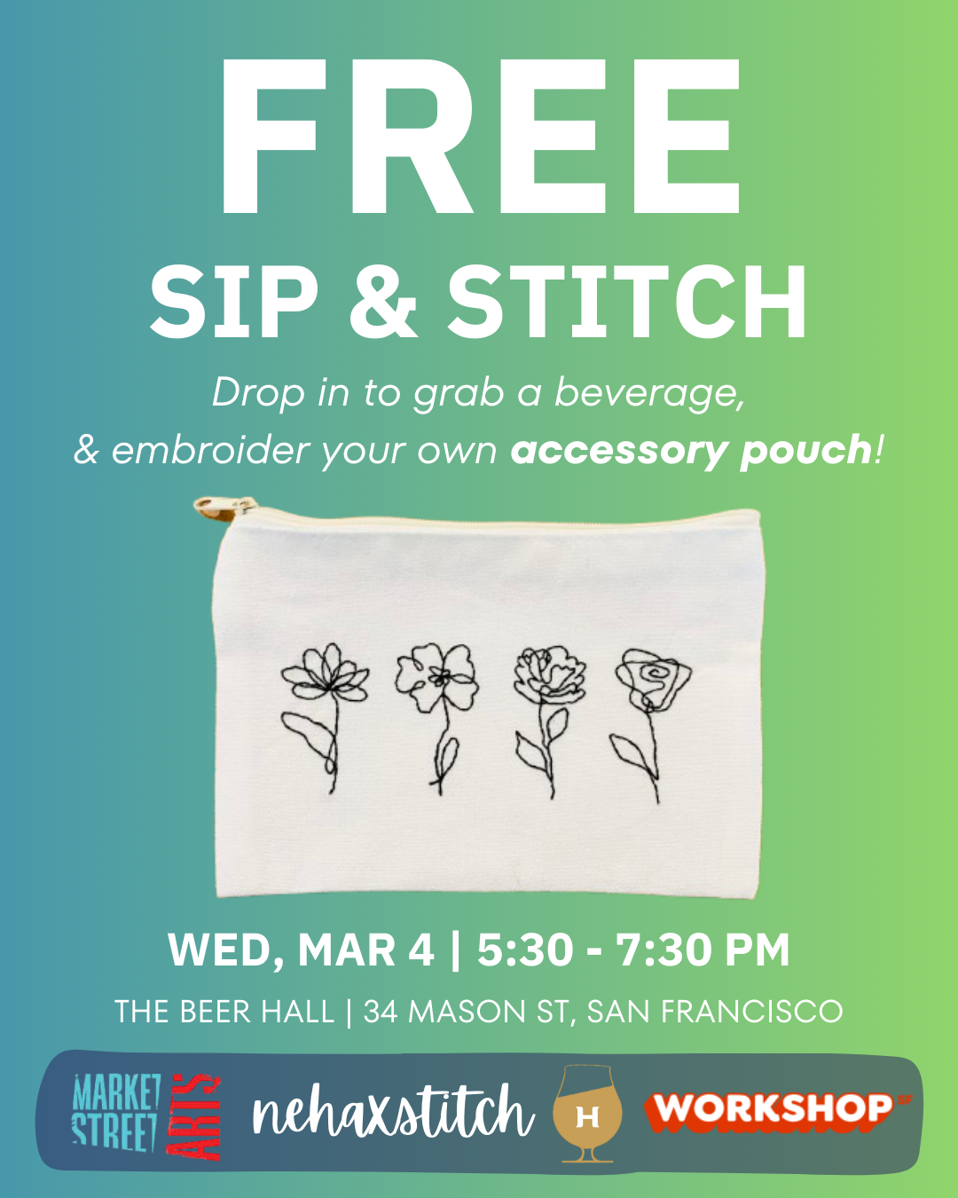 Not your average paint & sip! Grab a drink and a bite and embroider away and artist Neha (NehaXStitch) will provide everything you need: materials, inspiration, and instruction. You’ll learn to stitch your own accessory pouch! You'll get an intro to basic embroidery techniques, personalize your creation, and take home your unique, usable piece of art. No experience needed, just bring yourself and your creativity.